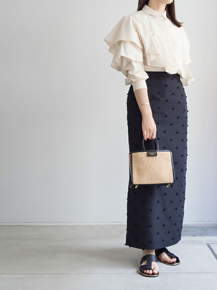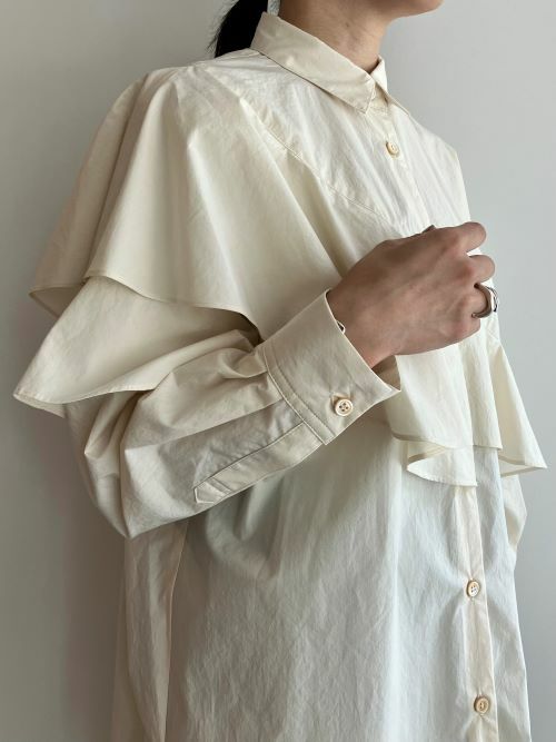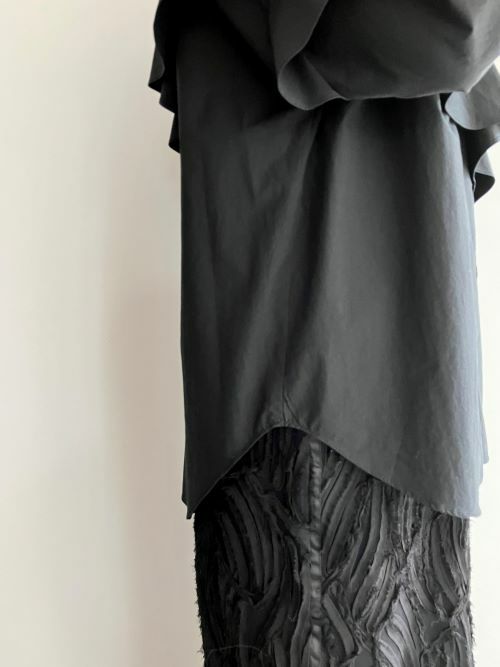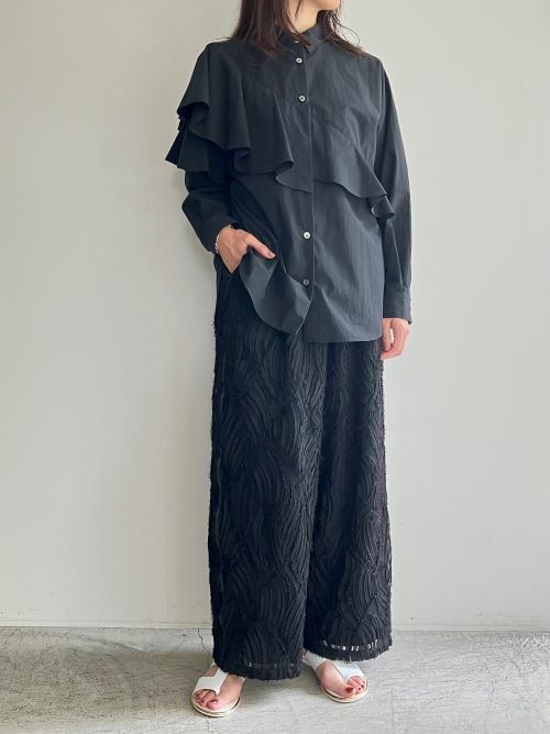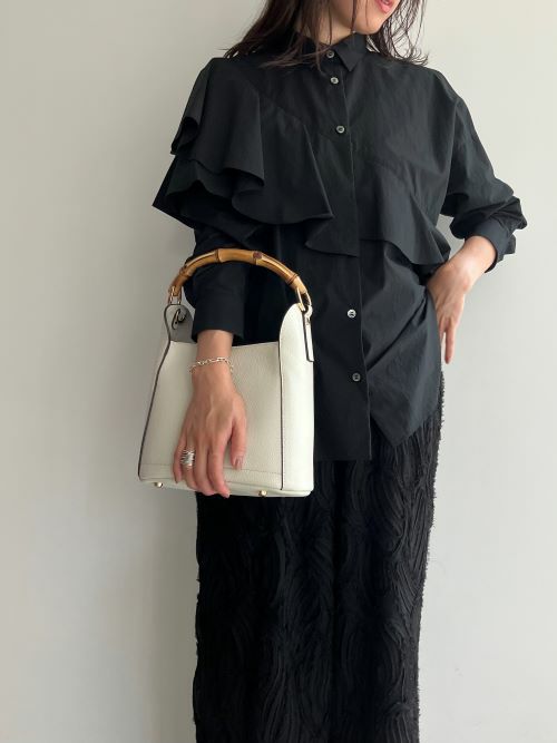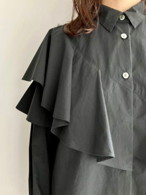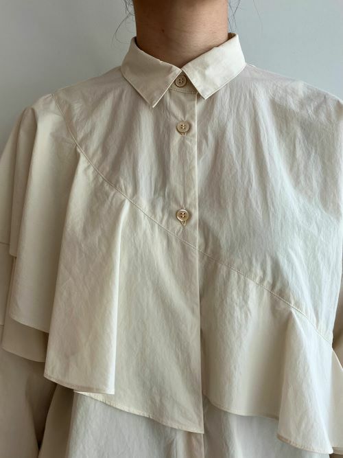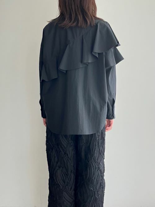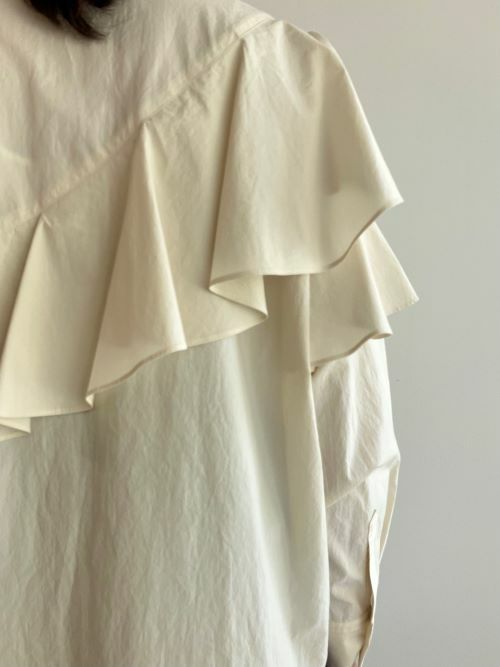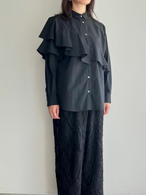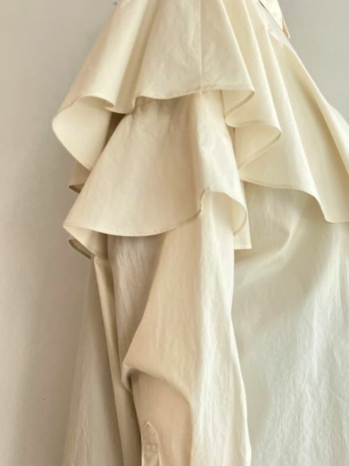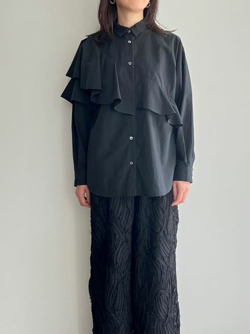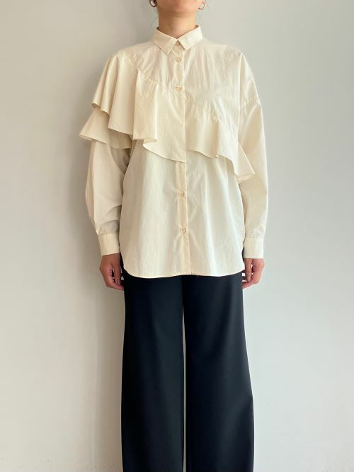 遊び心があるフリルブラウススタンダードなシルエットにたすき掛けフリルが立体的でポイントになるシャツです。張りのあるコットン生地でキレイ目にもカジュアルにも合わせていただけます。シンプルなコーディネートでも動きのある女性らしいスタイリングになります。