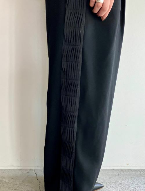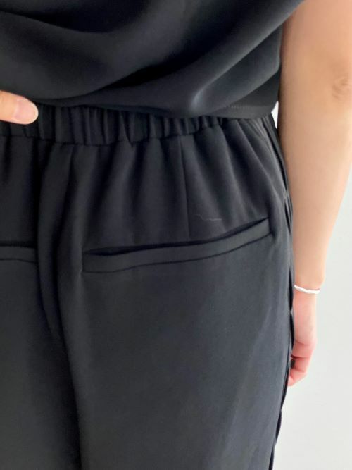 サステナブルなアセテートを主とする上質素材を使用したオールインワン。程よい肉感とラグジュアリーなドレープ感が特徴の生地は、経糸と緯糸どちらにもストレッチ性を備えています。ウエストは背面ゴム仕様で、更に調節可能なコード付き。
