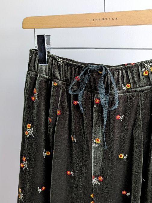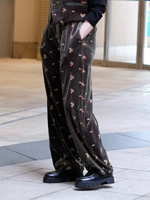 ベロア生地に花柄刺繍をあしらったワイドパンツ。レトロな雰囲気が可愛らしく、コーディネートのアクセントになります。