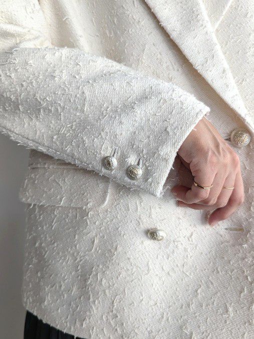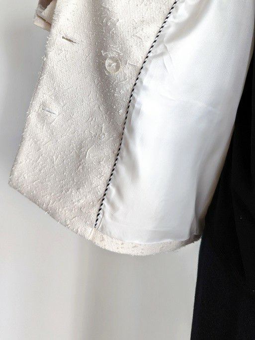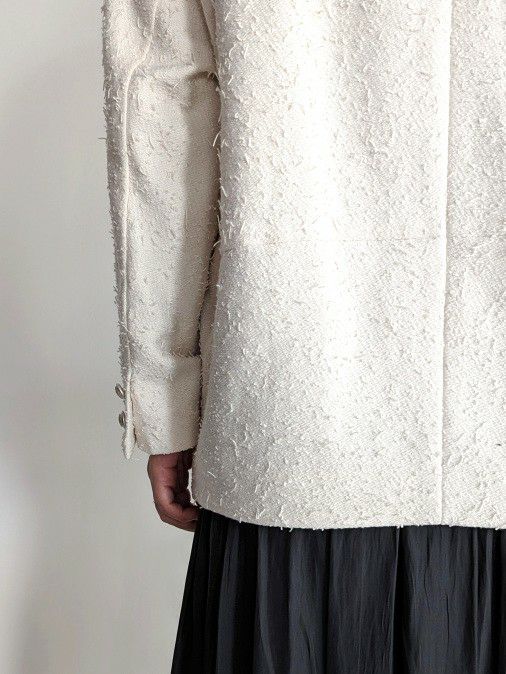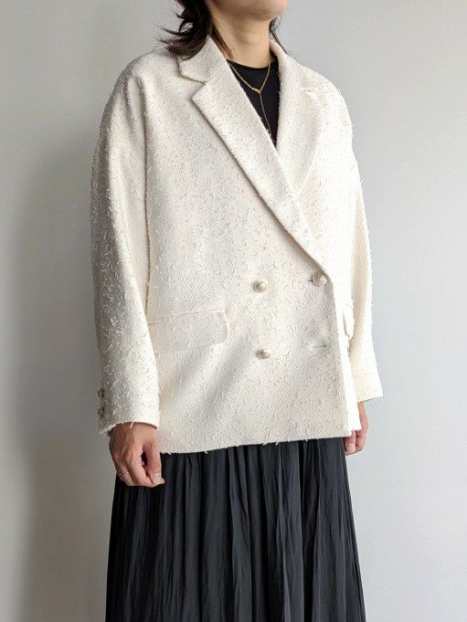 コットンの織生地にネップなどをあえて出したニュアンス生地が特徴のダブルジャケット。オーバーサイズのシルエットですが袖、着丈などはコンパクトにしてバランスのとりやすいフォルムにしています。中は総裏地でニット着用も可能で、軽いアウター感覚使いも出来ます。