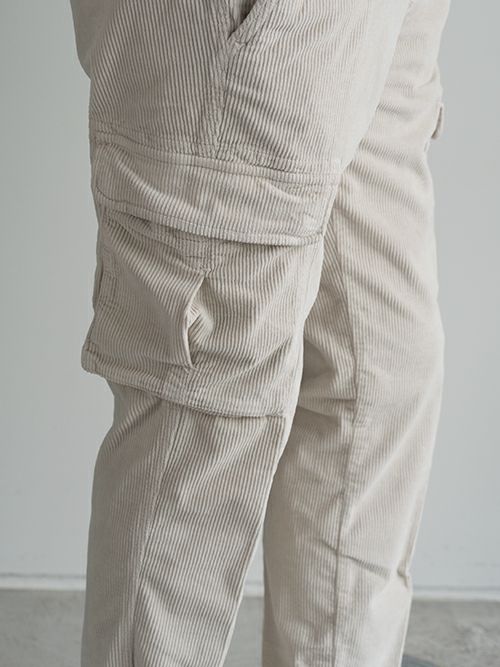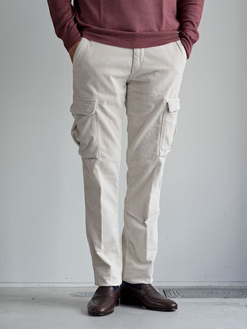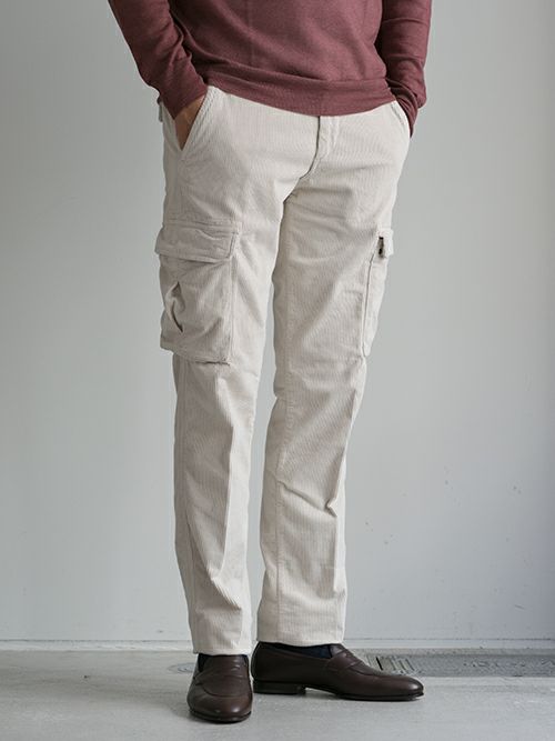 秋冬らしいコーデュロイ生地で、いわゆるドレスカーゴと言われるモデル。ノータックで股上も比較的浅く、全体的に細めのテーパードシルエットです。