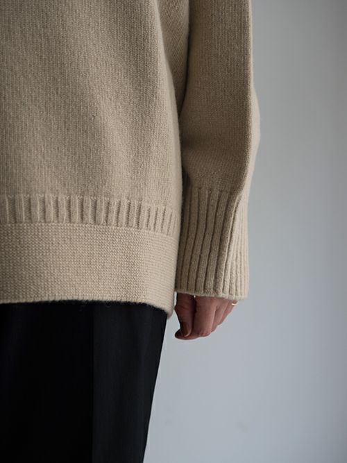 クラシカルなボトルネックがカジュアルさを抑えつつ、上品な印象に。アームホールやヘムラインの編み模様など、細かいディテールに拘っています。ゆったりとしたサイジングなので、シャツやブラウスなどとのレイヤードスタイルも楽しんで頂けます。ネックが詰まりすぎず大きくないのでフェイス周りもスッキリ魅せてくれます。