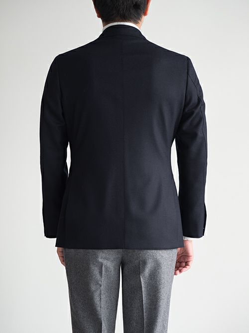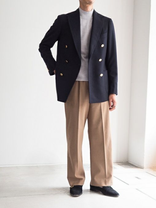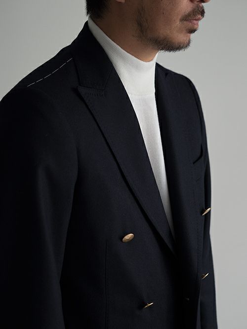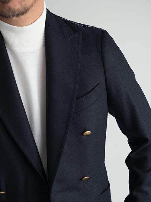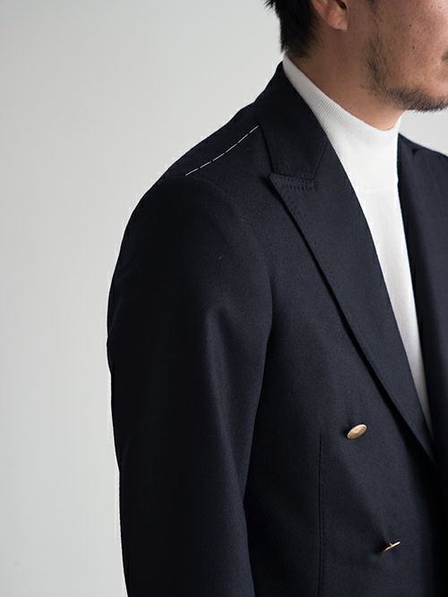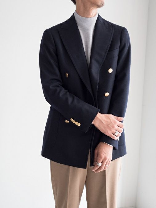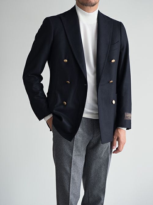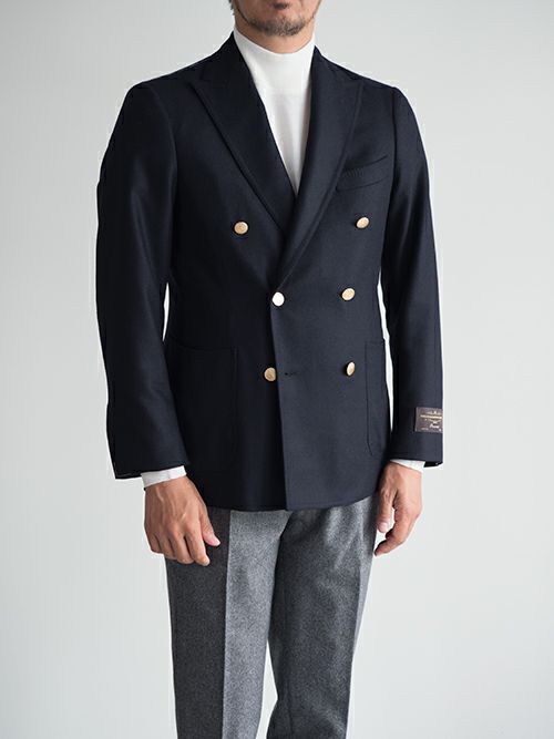 イタリアのCANONICO生地を使用したダブルジャケット。パッチポケット仕様で、着丈を短すぎず長すぎずのバランスにし、デニムやチノなどの カジュアルパンツは勿論、 グレーのウールスラックスにもしっかり対応してくれる秀逸なジャケットです。