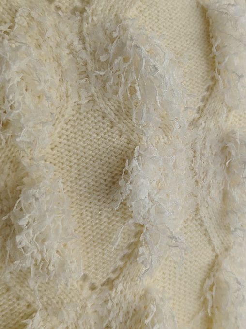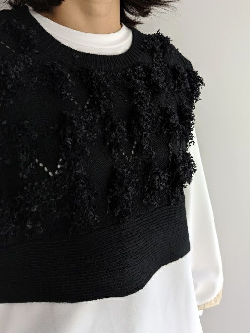 ボーダー状にテープヤーンを編み込んでからカットする事で、通常の糸よりもボリュームのあるフリンジに仕上がっています。ベースの編地は柄を組んでフリンジとなじむようなデザインです。端はあえてリブではなく片畦でスッキリと仕上げ、直線的な切り替えにしています。着丈は短めでトップスやワンピースと重ねると、ニットの切り替えのようなバランスで着用することができます。季節長く楽しんでいただけるベストです。