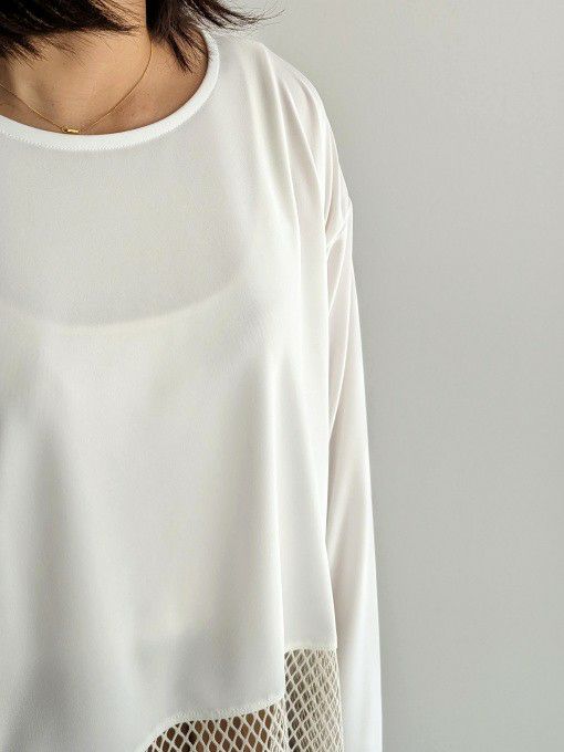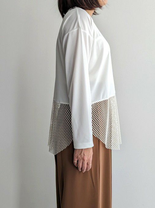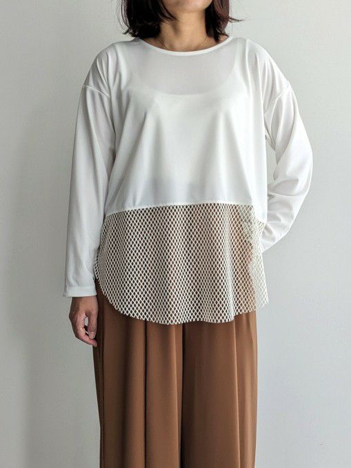 プレーンなスタイルにメッシュの切り替えがアクセントになったブラウス。程よく光沢感のある生地は華やかさがあり、オケージョンシーンにもフィットします。