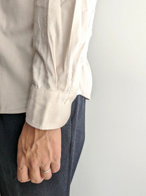 フランネルシャツ独特のマットな生地感が魅力的。襟のデザインと胸元の開きによって大人の色気を演出します。