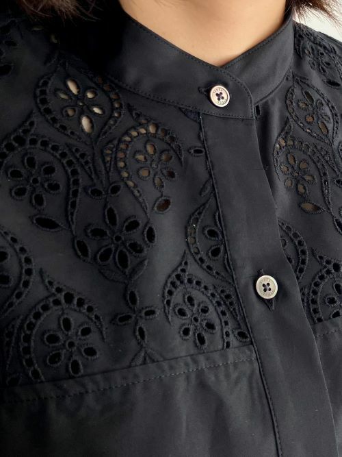 ヨーク部分は総レース、裾は同じ柄のパネルとスカラップにレース生地を使用したシャツブラウス。レースの甘さときっちりした衿元で凛とした雰囲気がでるシャツブラウス。前後のレース裾のカットが異なりサイドからの広がりもキレイです。