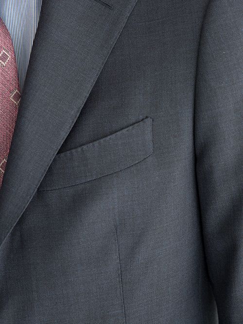 イタリアのCARLO BARBERA生地を使用した、軽やかな着心地の春夏のスーツ。タイドアップや、インナーにニットと合わせるなど、幅広く着用いただけます。ジャケットはノッチドラペル、フラップポケットで3つボタンの段返り仕様。毛芯には本バス毛芯(馬の尾毛)を使用し、衿元から胸にかけてハリを与え立体的なシルエットをになります。毛芯の中でも最高峰の物を使用しております。