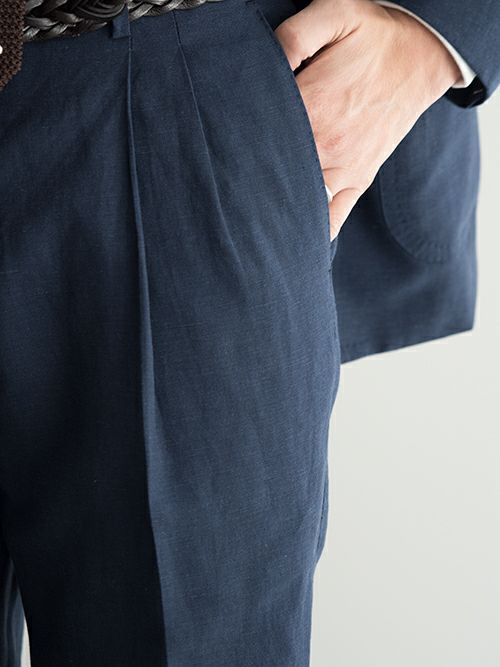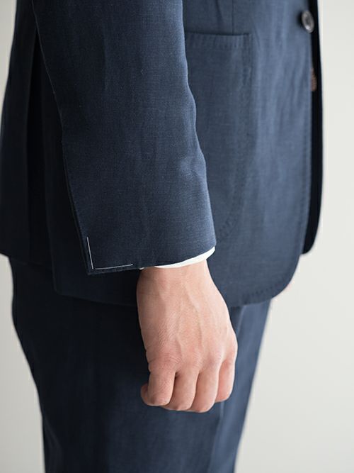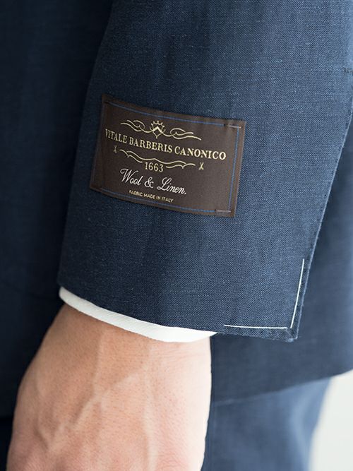 イタリア生地のVITALE BARBERIS CANONICO(ヴィターレバルバリスカノニコ)の生地を使用した、軽やかな着心地のリネン混スーツ。ジャケットはノッチドラペル3つボタンの段返り、腰ポケットはパッチポケット仕様。一枚芯を採用し、軽い仕上がり。組下のパンツはテーパードのかかった2プリーツモデルです。