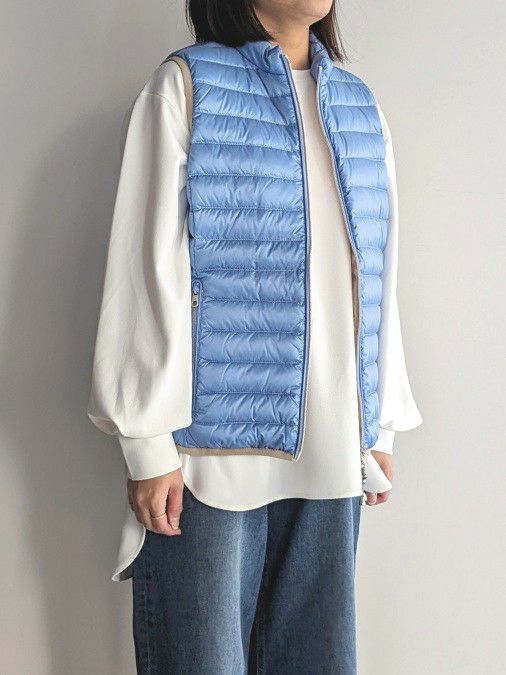 程よく艶感のある素材が上品で、年齢問わず着て頂けるデザインのダウンベスト。