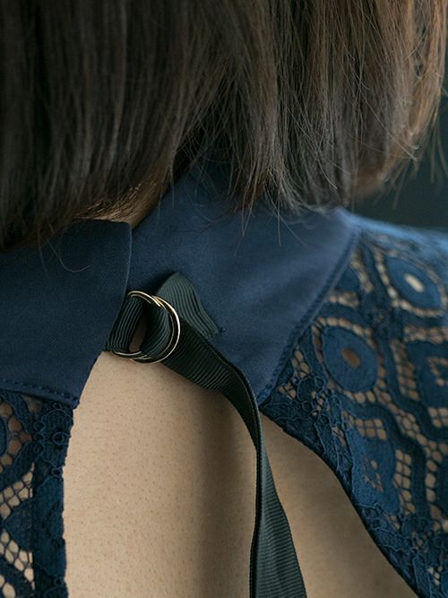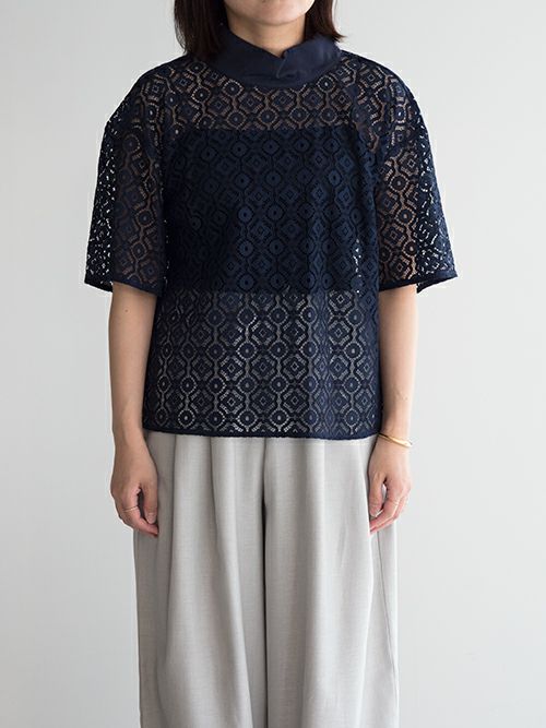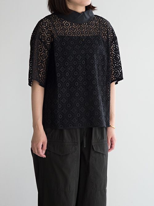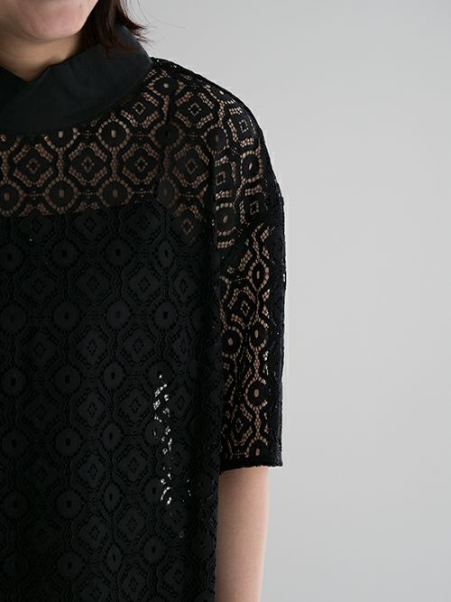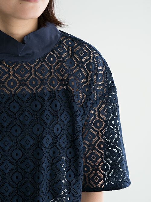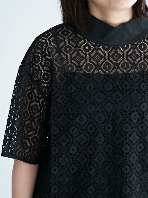 肌触りが良く、落ち感のあるテンセルレーヨン素材とのドッキングデザインで、シンプルなハイネックブラウスながらも、バックスリットとリボンテープの長さで女性らしい変化をつけました。レースの上品さと、美しいシルエットに拘った存在感のあるアイテムです。