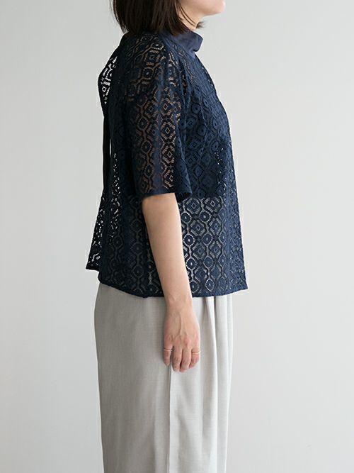 コットンとナイロンの高級感と立体感を併せ持つ、幾何学柄レースを使用したバックリボンブラウス。
