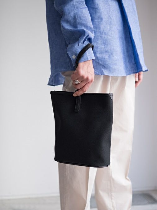旧式シャトル織機で作られた、撥水性のあるリサイクルポリエステル生地を使用したワンハンドバッグ。スタイリッシュで洒落た雰囲気を纏いながら、軽さと丈夫さ、そしてシンプルなデザインで飽きがきません。財布やスマートフォンなど最低限の物が収まるサイズ感も魅力的で、デイリーに使い勝手の良いアイテムです。
