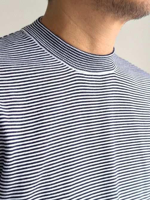 カジュアルな印象の強いボーダー柄ですが、ピッチを細くし、肩口のシルエットもすっきりとコンパクトにする事で、落ち着いた印象の一着に仕上がっています。カットソーの代わりに気軽に着ていただければ、カジュアル過ぎない大人のコーディネートを演出できます。