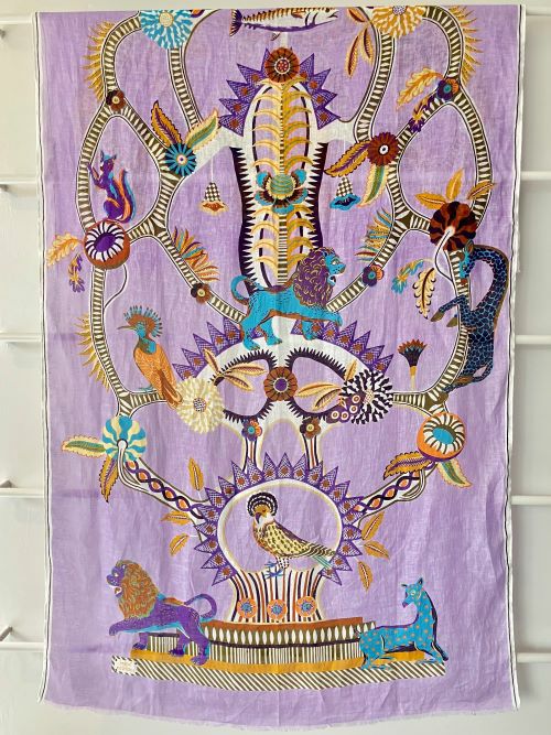 島やシマウマ、魚などが描かれた上品なアニマルデザインのスカーフ。エキゾチックな雰囲気ながらシックなカラーリングで、様々なスタイルに馴染む魅力的な一枚です。
