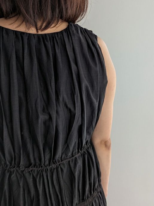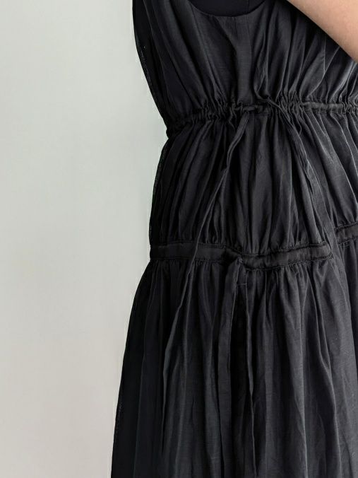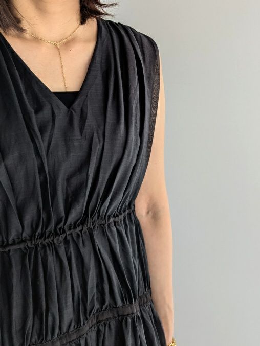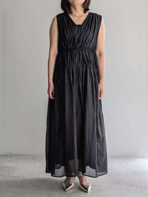 コットンとラミーをブレンドした素材を使用したワンピース。2段階のドローコードによるシルエットの調整が可能で、全体にギャザーが広がり、動きのある表情を楽しめます。カラーはブラックながら、ほんのりとした透け感があり、軽やかで柔らかな印象に仕上がっています。