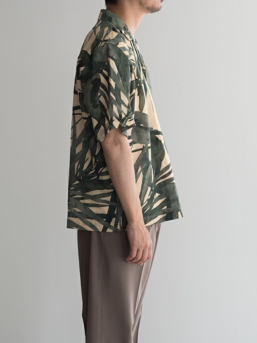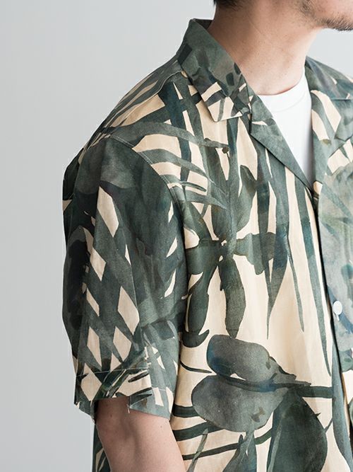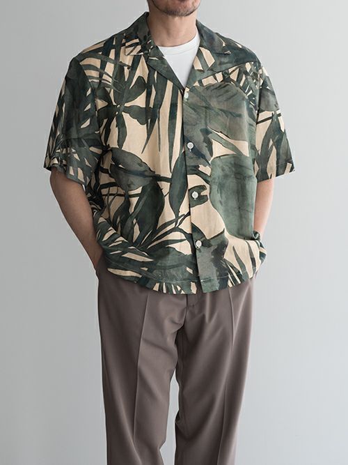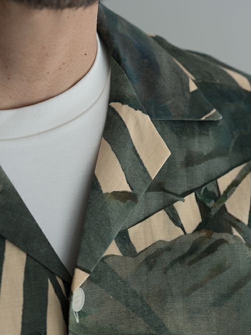リゾート感漂う大胆なリーフプリントが目を惹くオープンカラーシャツ。ナチュラルなベージュベースに、深みのあるグリーンのリーフ柄をあしらい、落ち着きと華やかさを両立しています。