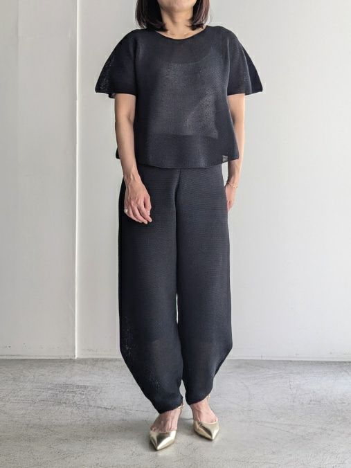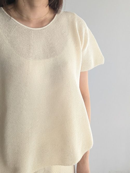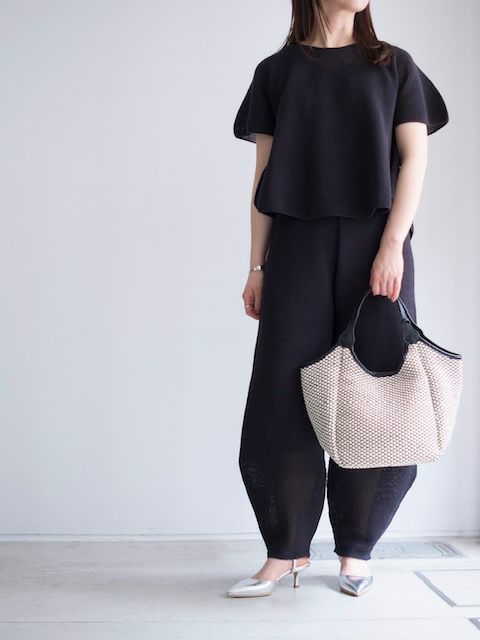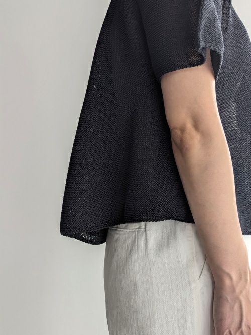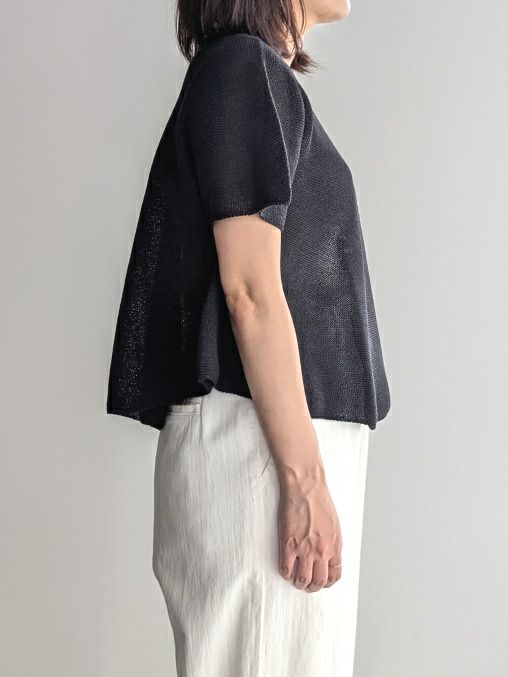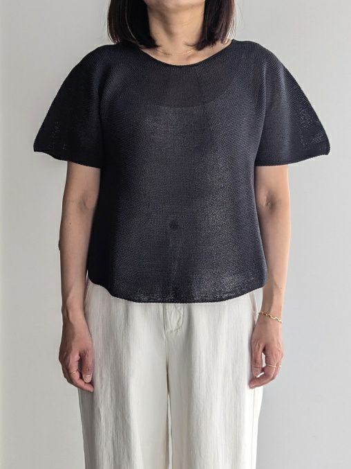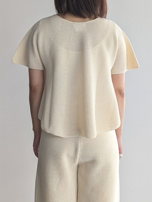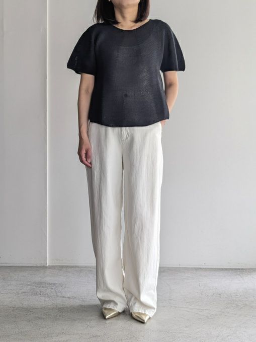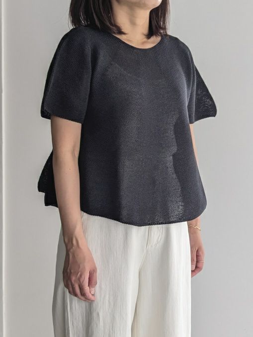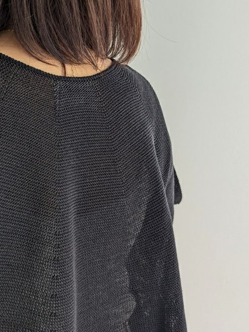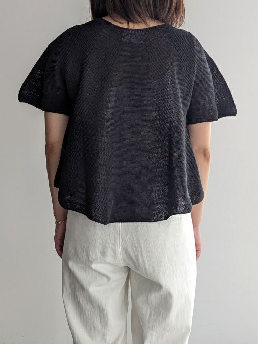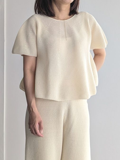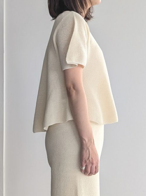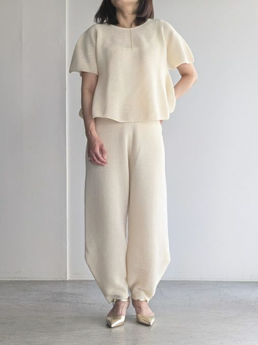 和紙素材混紡のシャリ感のある爽やかな風合いと、裾に向かって広がるフレアシルエットが美しく、ホールガーメントで肌あたりがよく軽やかに揺れるデザインはこれからの季節にもぴったりです。