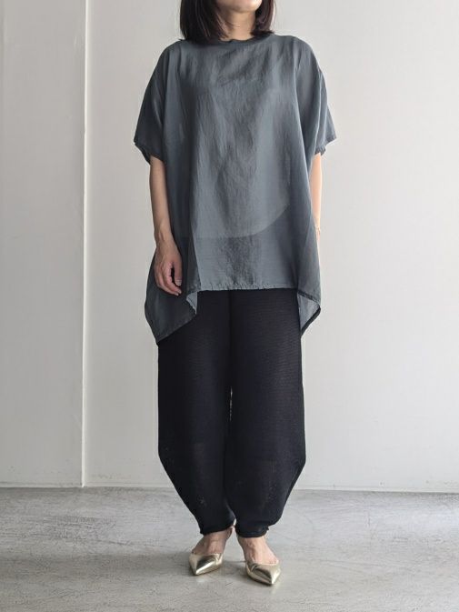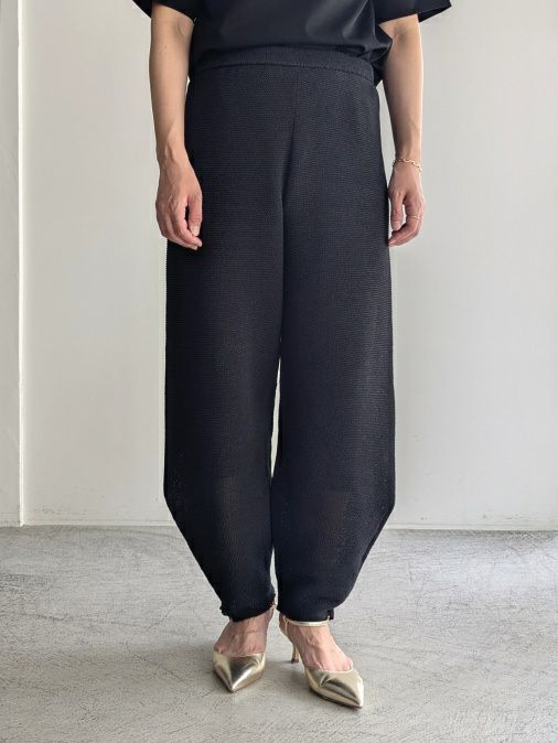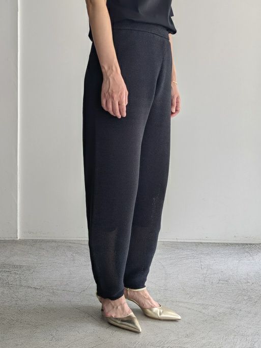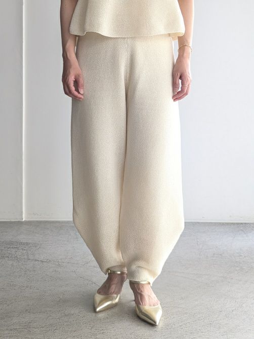 和紙素材混紡の涼やかな風合いが魅力のニットパンツ。ほどよくゆとりをもたせたバルーンシルエットが、裾にかけて自然に細く絞られ、リラックス感のあり洗練されたラインを演出します。肌にやさしい裏地付きで、心地よい履き心地。これからの季節にぴったりな、上品さと軽やかさを兼ね備えた一着です。