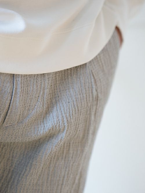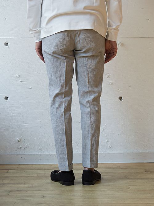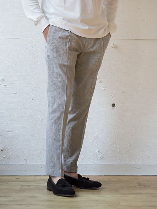 1プリーツのテーパードスリムフィットで、クロップ丈がスタイリッシュな印象。