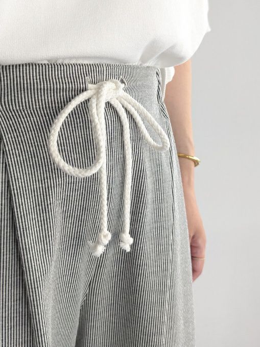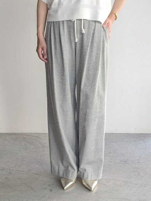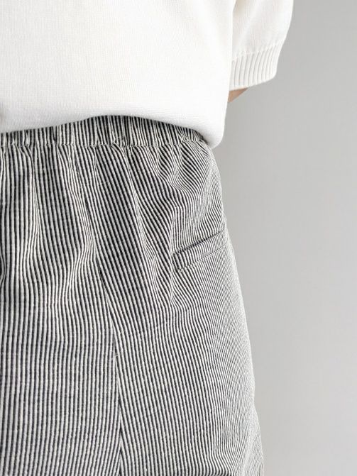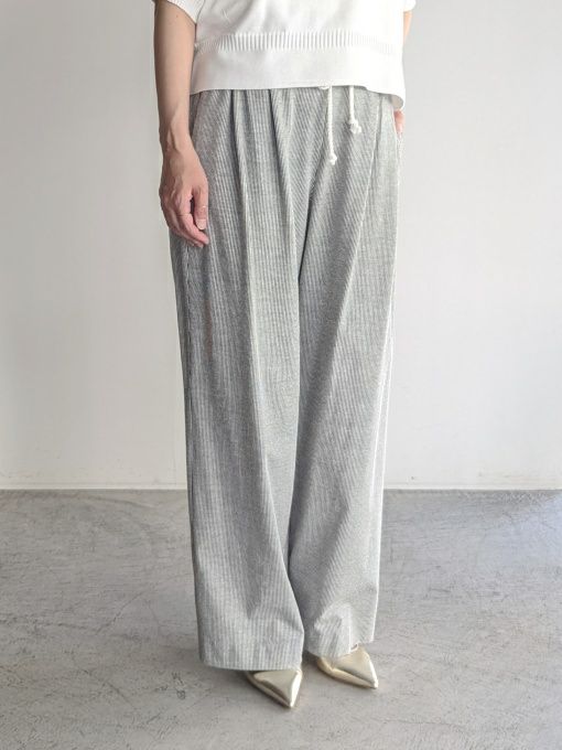 爽やかなストライプ柄が印象的なイージーパンツ。軽やかで通気性の良い素材を使用し、暑い季節にも心地よく着用できる一着です。ウエストはリラックス感のあるゴム仕様に加え、ドローストリングでサイズ調整も可能。ナチュラルな紐がデザインのアクセントになり、カジュアルな抜け感をプラスします。