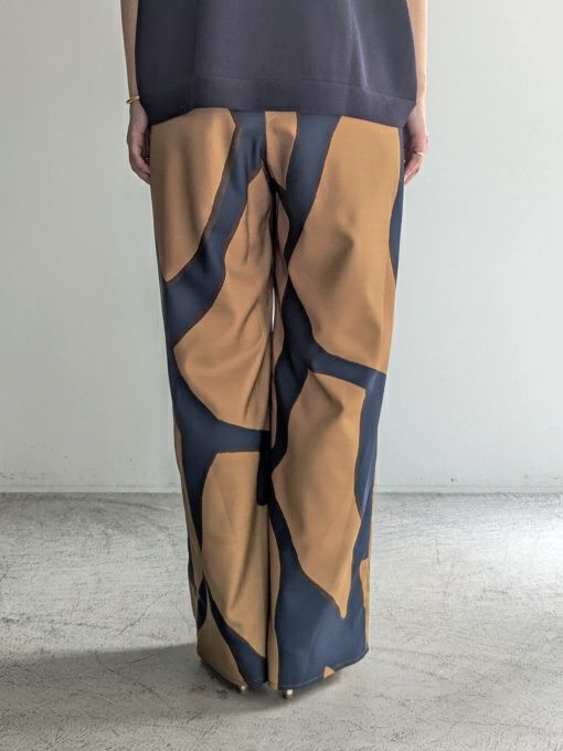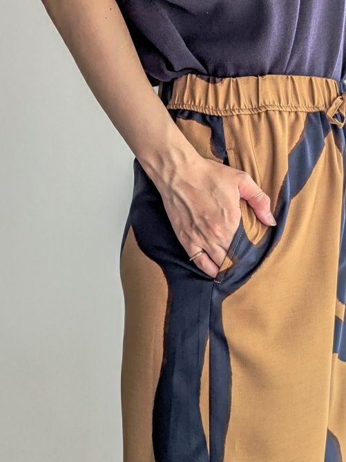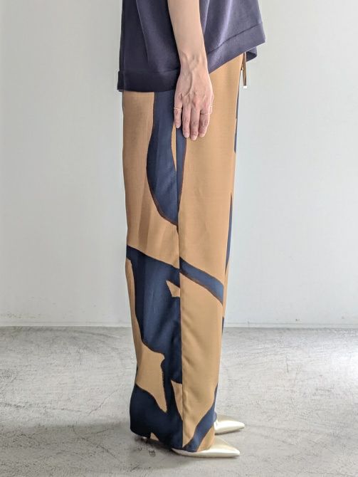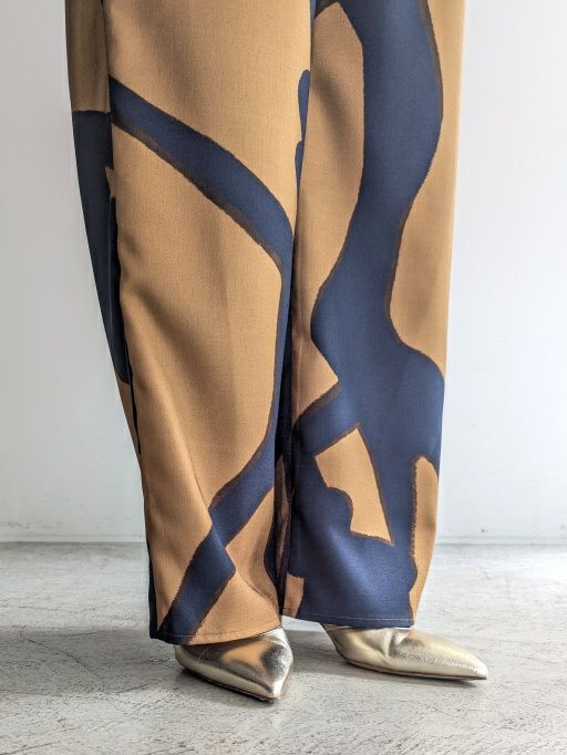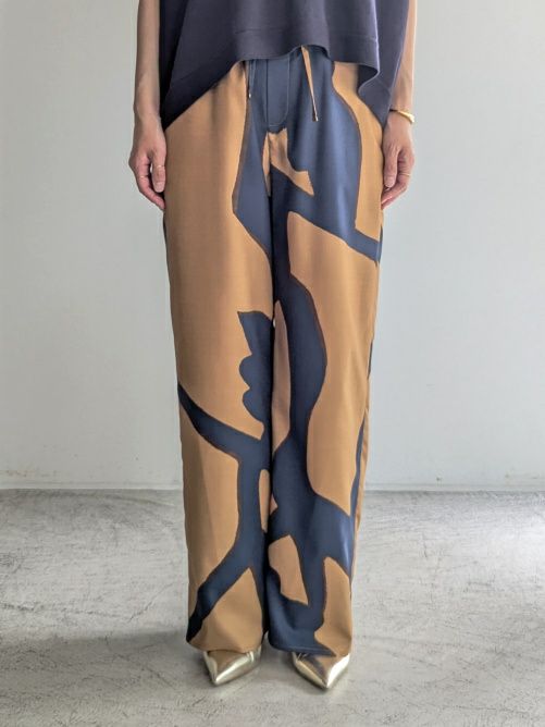大胆なアートプリントが目を引くイージーパンツ。抽象的なラインと色使いが存在感を放ち、コーディネートにアクセントを添える一着です。落ち感のある柔らかな素材が、リラックス感とモードな雰囲気を両立。さらっとした肌触りで、ロングシーズン快適に着用できます。