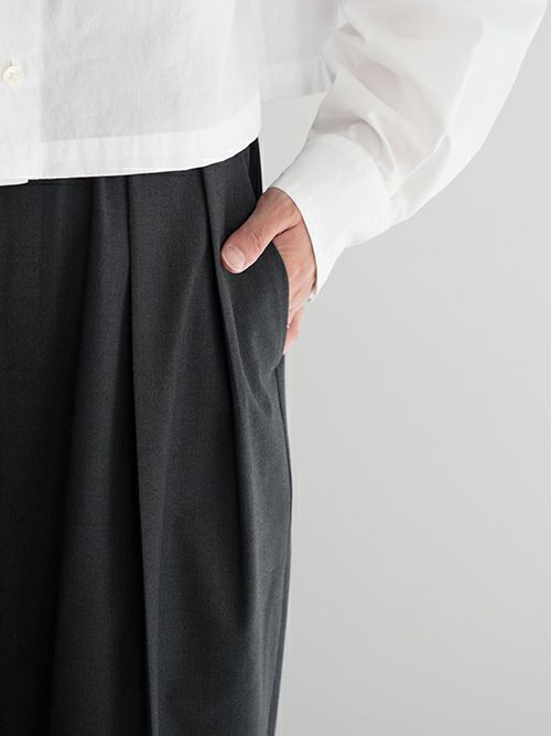 2タックのオーバルシルエットのパンツをイージーに仕上げた一枚。ヒップから裾にかけてぐっとテーパードさせたメンズライクな2タックイージーパンツ。裾ダブルの仕上げは足元に重厚感が生まれクリースラインを際立たせます。ウエストはゴム仕様に加えフィット感を高めるドローストリング仕様に。
