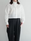 フリルカラーにデタッチャブルの共地リボンをあしらいクラッシックなムードを漂わせる新ブラウス。ボディは、ショートレングにし、リラックスフィットながら大人が着こなせるシルエットに仕上げました。