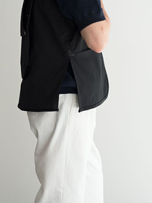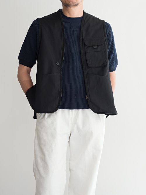 収納力抜群なポケットがフロント、バックに多数配置されており、男心をくすぐる機能性がそのままデザインの高さにつながったベスト。背面の大きなポケットはドローコード仕様です。