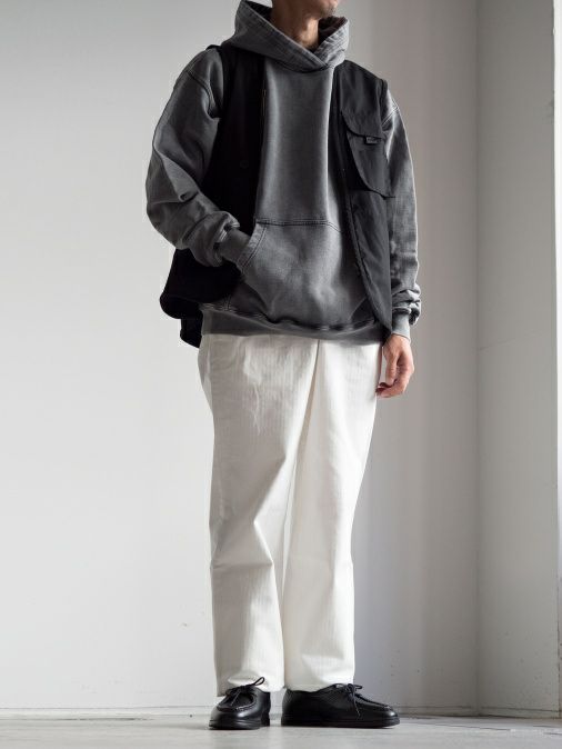 コーデュロイのパイピングが立体感を生み、裾両サイドに入ったスリットが動きのアクセントにもなる一着。スリット上の補強は牛革を使用しています。