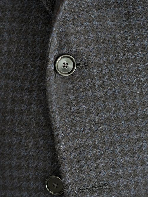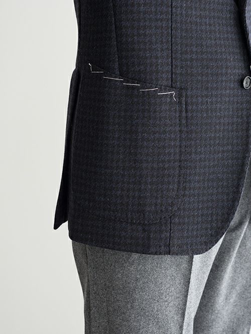 コンパクトな肩幅や高く登った登り。メリハリの効いたシルエットや丸みのあるポケット。ダブルステッチやマニカカミーチャなど、様々な拘りのディテールが目を惹く至極のハウンドトゥース柄ジャケット。