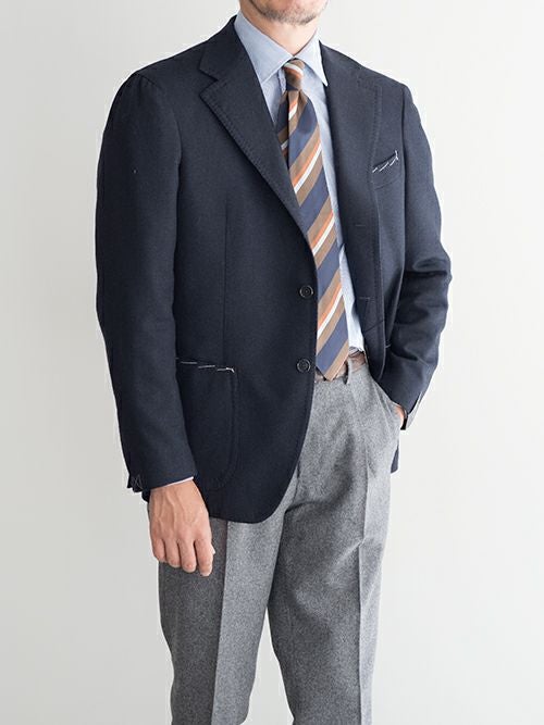 タイドアップからニットと合わせたコーディネートまで、幅広く合わせていただけます。鉄板カラーのNAVYジャケットですので、インナーの色は選びません。着用モデルのようにブルー系のシャツでコーディネートいただくと、統一感のある大人のジャケットスタイルが完成します。