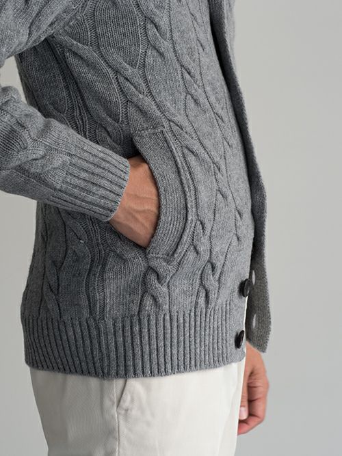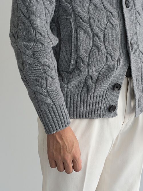 厳選されたウールを使用したケーブル編みのローゲージニット。ハンドポケットが付いており、アウターとしての見栄えも良い一着です。