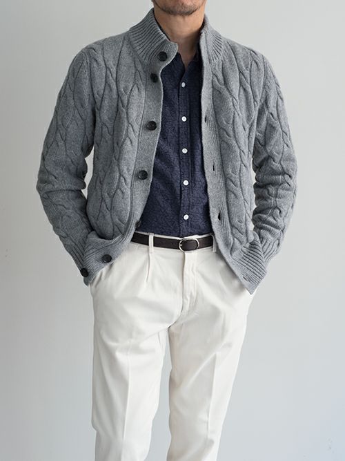 前釦を開けても留めても様になる万能ニット。真冬はコートのインナーとしても活躍してくれる一着です。定番のグレーは色合わせの汎用性も高く、ボトムスの色を選びません。着用モデルのようにホワイトパンツと合わせた清潔感のあるコーディネートもお薦め。