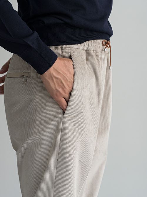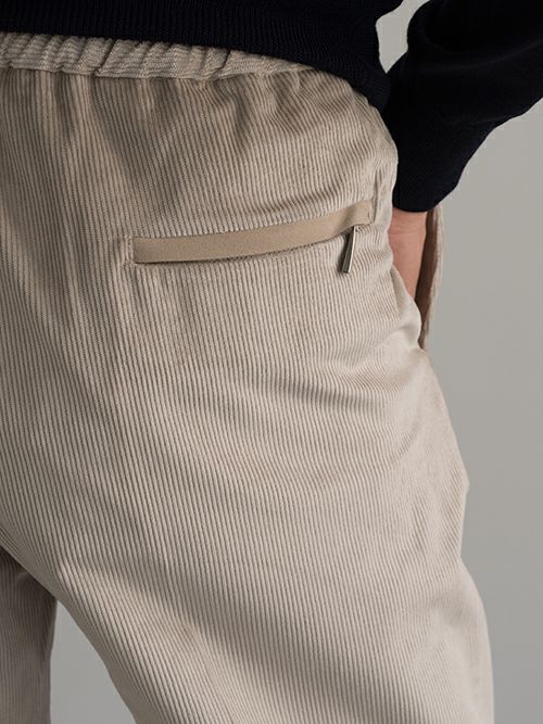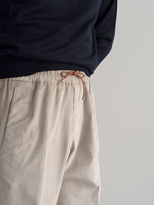 コーデュロイ生地のイージーパンツ。ウエストは快適な履き心地が叶うゴム仕様で、フロントのドローコードでサイズの微調節も可能でです。