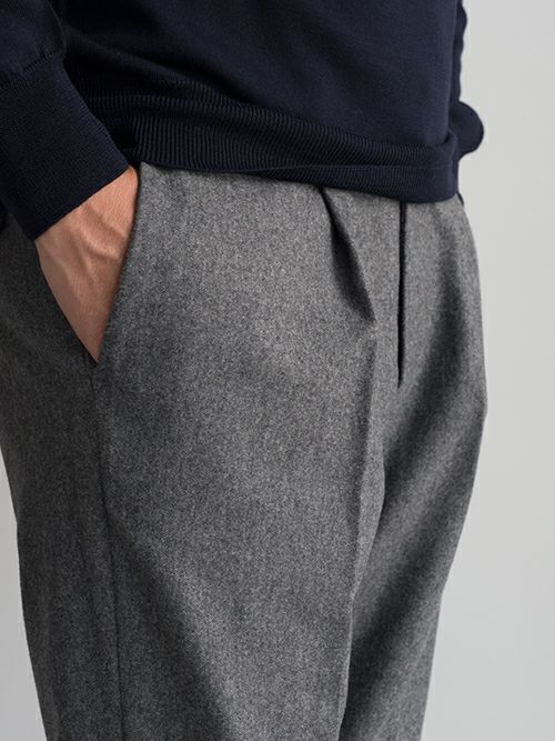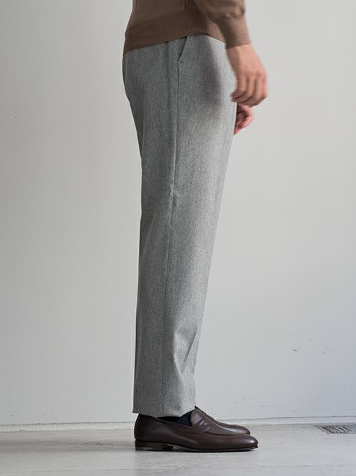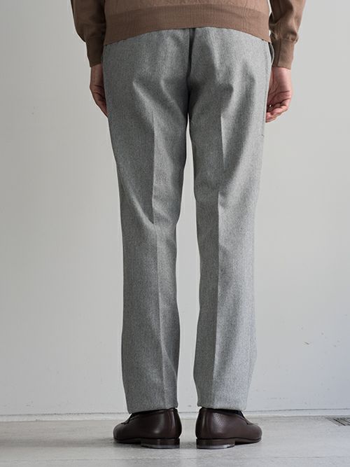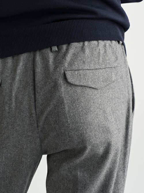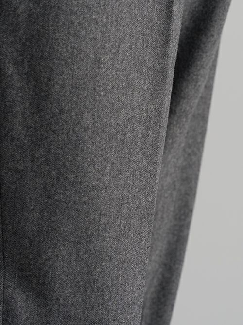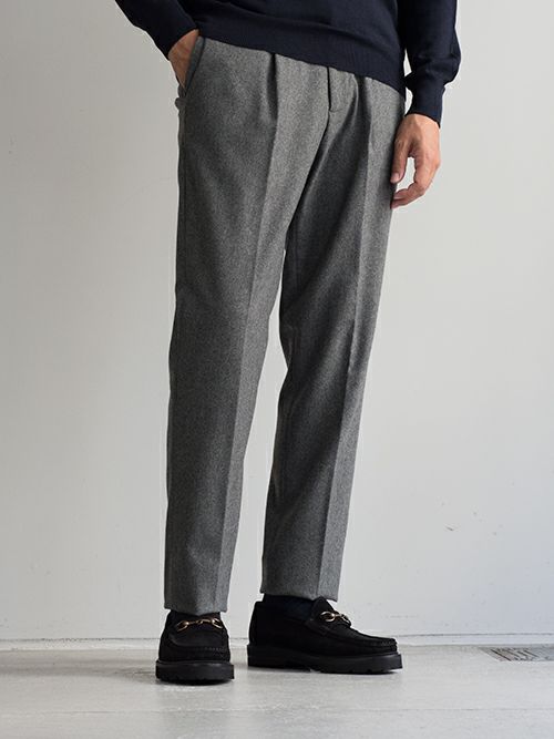 ウールとポリエステル生地のワンプリーツスラックス。ウエスト背面はシャーリング仕様ですので、程よく腰回りにゆとりがあります。