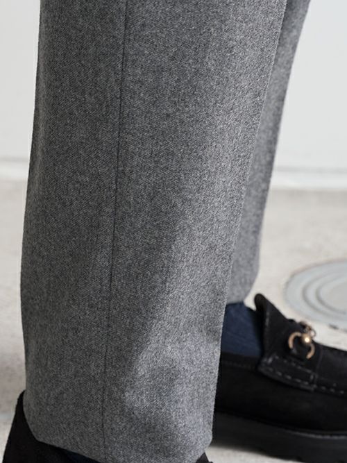 裾がタタキ仕上げになっているのでスニーカーにも合わせやすく、カジュアルからジャケットスタイルまで活躍する一着です。秋冬に適した温かみのある生地感も魅力の一つ。