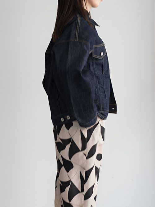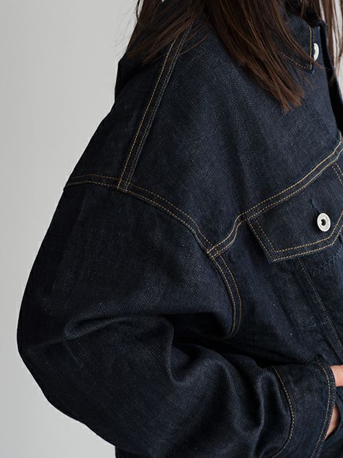 オーバーサイズでコンパクトな丈感が、旬のシルエットを作り出すジーンジャケット。肩もドロップしており、ゆったりとした着用感です。