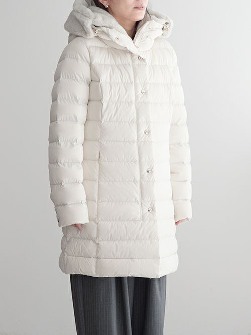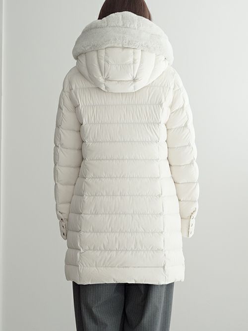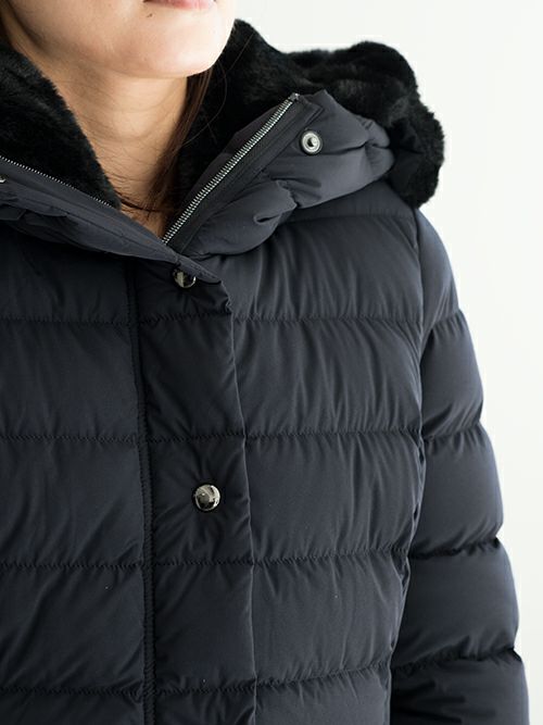 ボディラインに沿ってシェイプされたシルエットが、スタイルをより美しく見せてくれるモデルSANTACRUZのエコファー付きダウンコート。ファーはネックとフード部分で、脱着可能です。