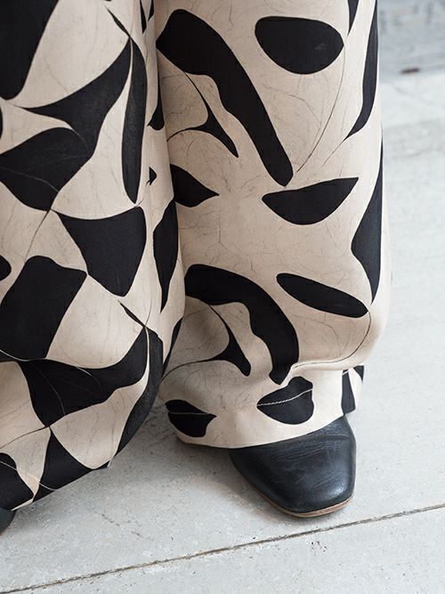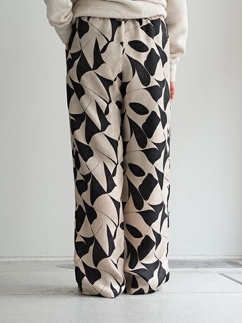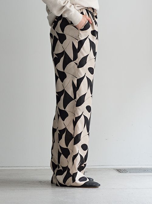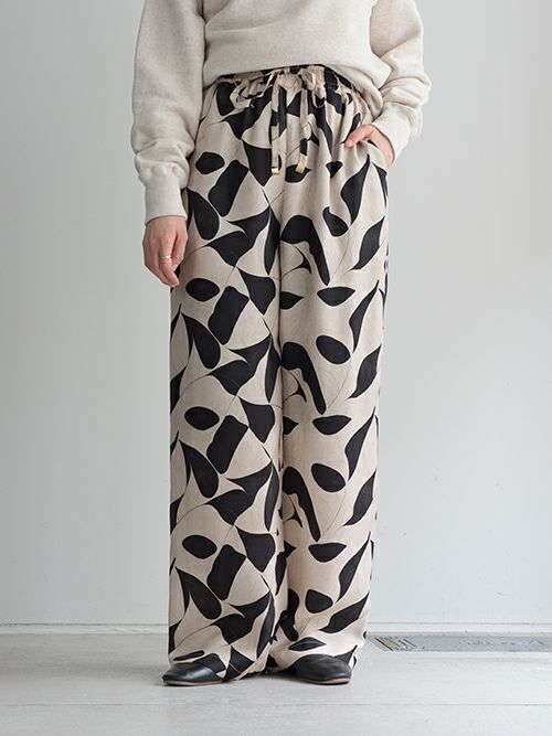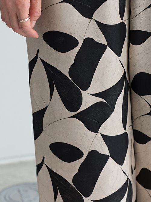 印象的なリーフモチーフの総柄プリントが着こなしにモダンなアクセントをプラス。ウエストは総ゴム&ドローコード付きで、リラックス感のあるイージーなはき心地。膝丈までの裏地付きで安心感もプラス。ゆとりのあるシルエットと、自然に落ちる柔らかな生地が美しいドレープを演出。上品な光沢感とシワになりにくい素材も魅力です。