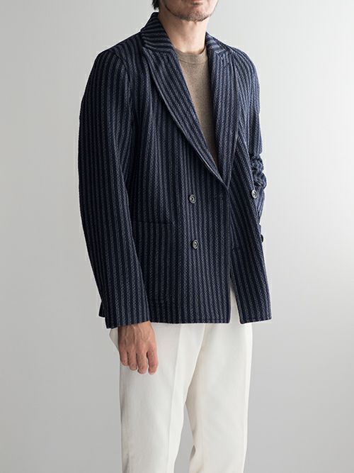 ウールナイロン混のダブルブレストジャケット。裏地なしの軽やかな着心地が魅力的です。