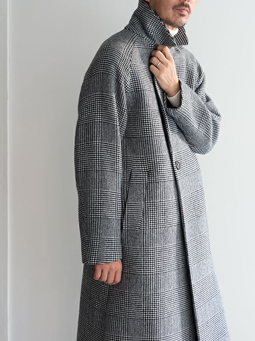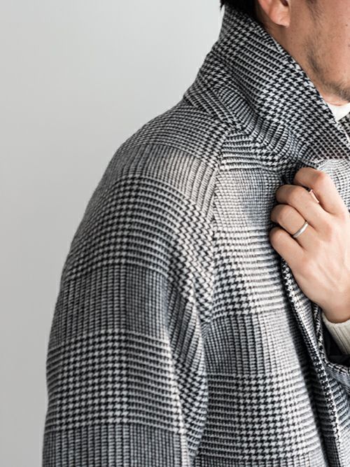 ウール、ナイロン混生地を使用したセミダブルコート「SURBO(スルボ)」。トレンドをおさえたゆとりのあるラグランスリーブのシルエットに、Hevoならではの独特なAラインとグレンチェック柄がモダンな雰囲気を生み出します。