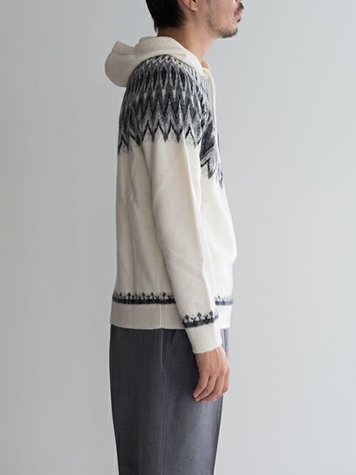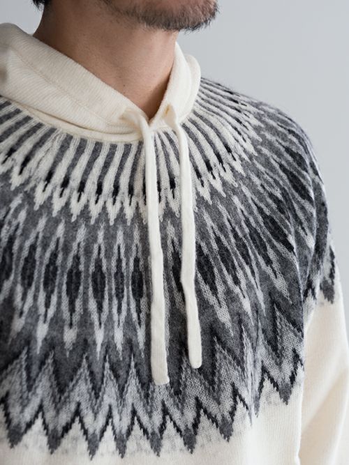 ウール、アルパカ、ナイロン混のニットフーディー。ノルディック柄がどこかレトロな雰囲気を演出しつつ、決して幼い印象にならないバランス感覚が抜群のデザインです。