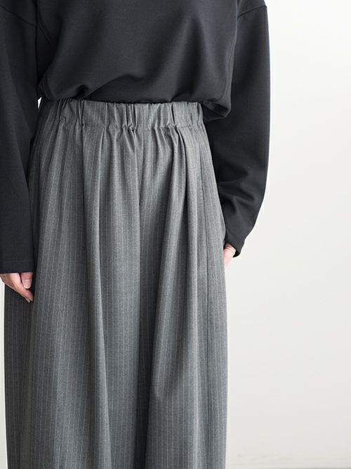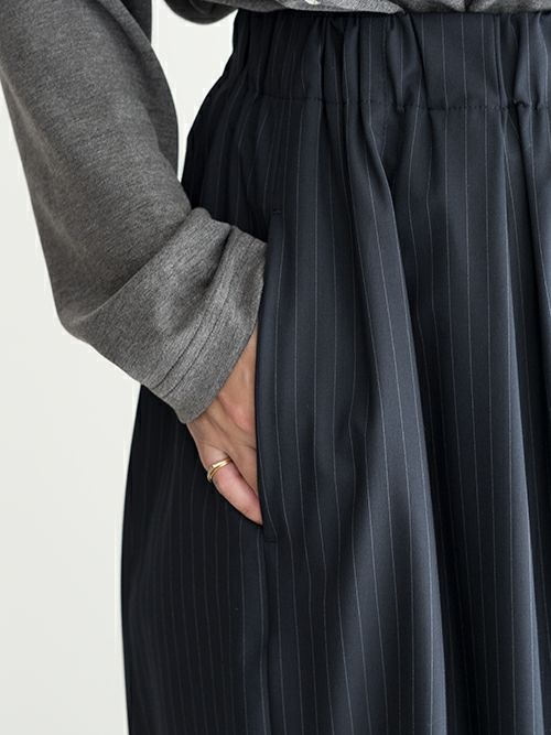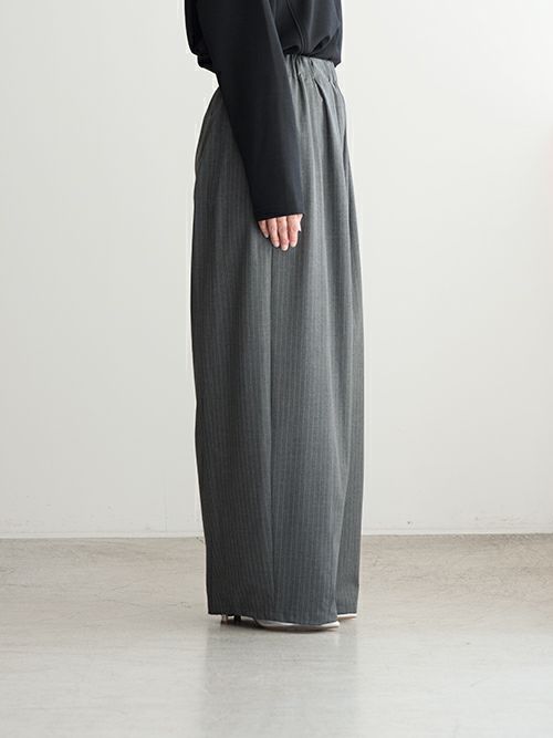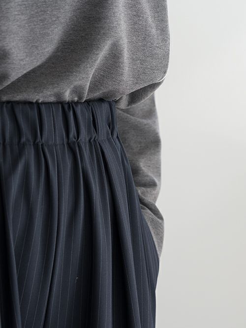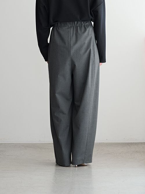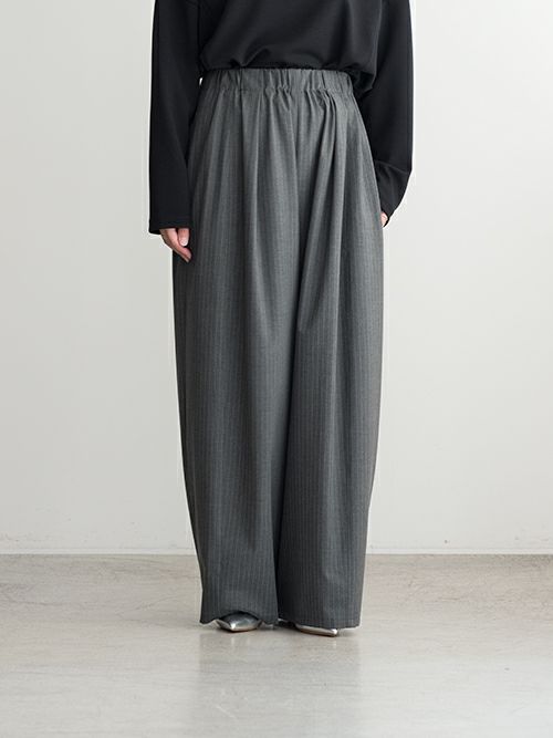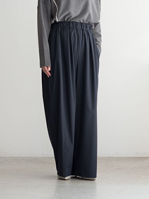 ゆったりとしたシルエットのワイドパンツです。ウエストはゴムになっており、リラックスして着用できるイージーパンツタイプです。生地にはピンストライプがあしらわれており、カジュアルになりすぎず、きれいめな印象を与えます。