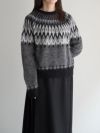 アルパカ、ナイロン、ウール混のクルーネックニット。ノルディック柄がどこかレトロな雰囲気を演出しつつ、決して幼い印象にならないバランス感覚が抜群のデザインです。肩回りはラグランスリーブ仕様。とても柔らかで肌触りもよく、ミドルゲージで着用しやすい風合いです。