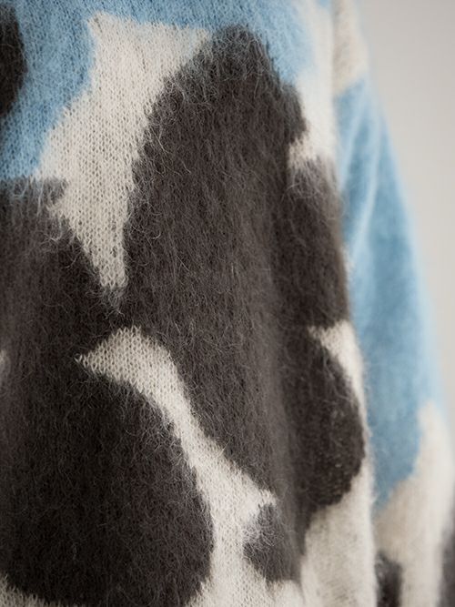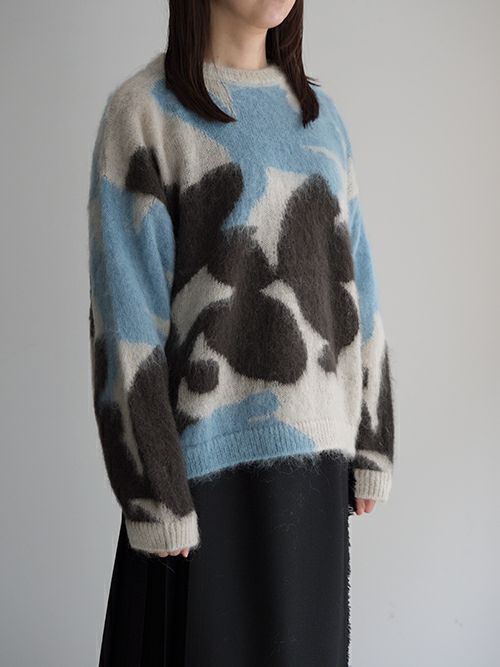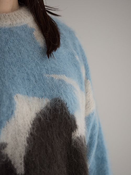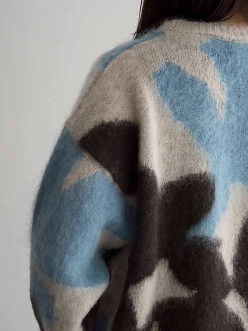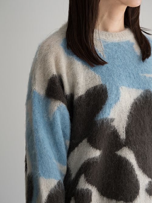 手描き風の大胆なカラーパターンが目を惹くアートのような一枚。モヘア混の素材はふんわり柔らかく、軽くて暖か。ほどよくゆとりのあるシルエットで、さらっと着るだけで主役になるニットです。