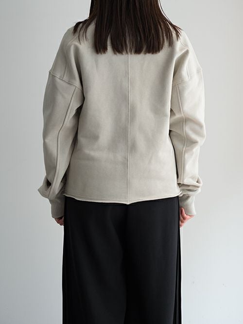 密度高く編まれた綿100%のスエット素材を使用。洗いをかけたような風合い、色出しが特徴的な生地で高密度な編みにより中肉でありながらヘビーオンスの風合いを実現しています。深いVライン特徴的なショートトップはヘムラインを断ち切り始末することで抜け感をプラス。たっぷりとした身幅とドロップショルダー、長めに設定された袖のバランスに、ショート丈がノスタルジックでもありながらも新しさを表現。70年代の雰囲気を現在に落とし込んだ一枚です。