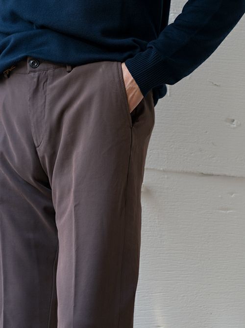 レーヨンストレッチ素材のブラウンカラー、シックで新しいフィッティング感です。