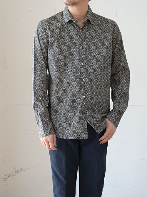 レギュラーフィット ネイビーベースのプリントシャツ、程よいフィット感です。