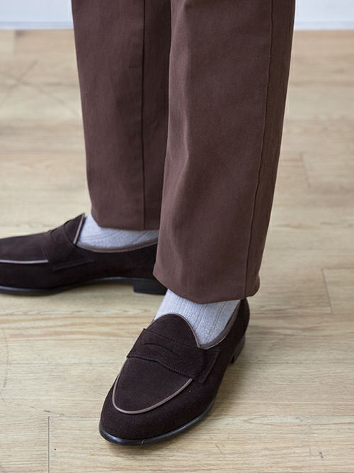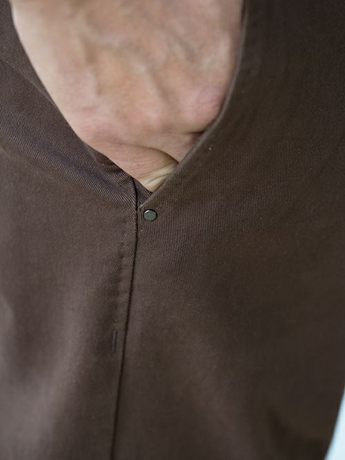 人気のテーパードパンツSASAL、ブラウンのコットンストレッチ素材を使用した一着。
